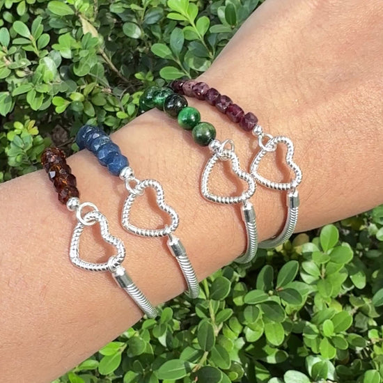 Brazalete con cuentas de ojo de tigre verde y cadena de plata para charms tipo moments.