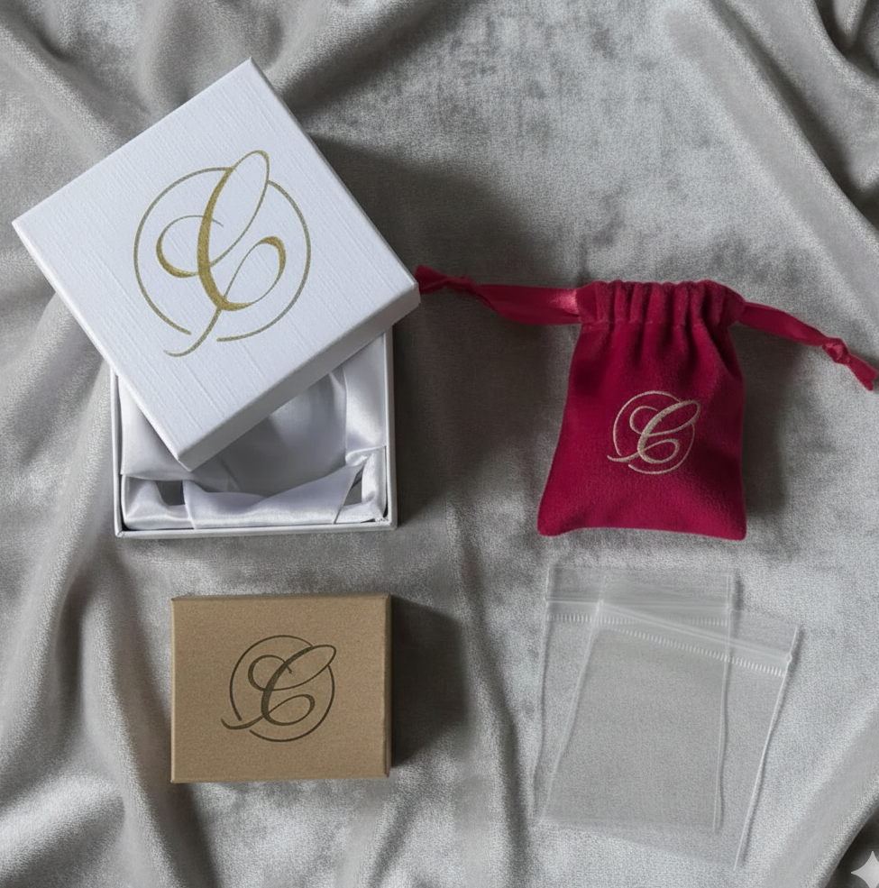 Todas nuestras joyas incluyen de cortesía: caja rígida protectora (ajustada al tamaño de tu pieza), cubre polvo de tela y bolsa hermética para conservar el brillo de tus piezas.